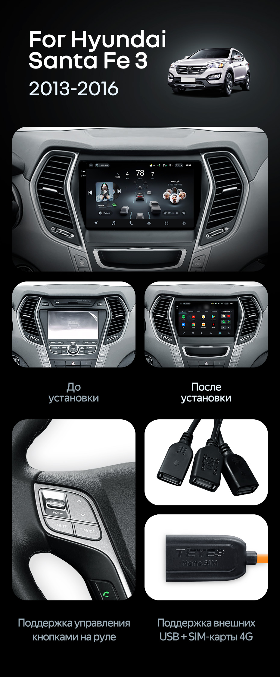 Штатная магнитола Teyes CC4 8/128 Hyundai Santa Fe 3 (2013-2016) Тип-C - купить всего за 55 200 руб. в интернет-магазине в Йошкар-Оле Teyes.com.ru. ✓ Самый лучший выбор мультимедиа ✓ Лучшая замена штатному ГУ ✓ Тел. +7 (800) 775-31-74