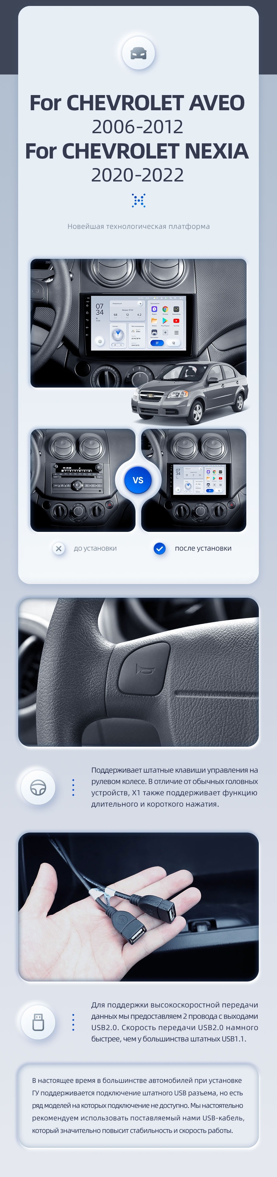 | USB | 3×USB 2.0 + USB 3.0 | Доп. аксессуары | Передняя/задняя AHD-камера, DVR-регистратор, TPMS, парковочный OBD, Type-C → HDMI |