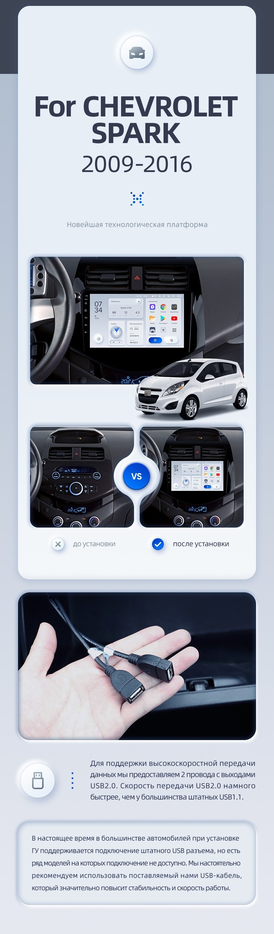 | USB | 3×USB 2.0 + USB 3.0 | Доп. аксессуары | Передняя/задняя AHD-камера, DVR-регистратор, TPMS, парковочный OBD, Type-C → HDMI |
