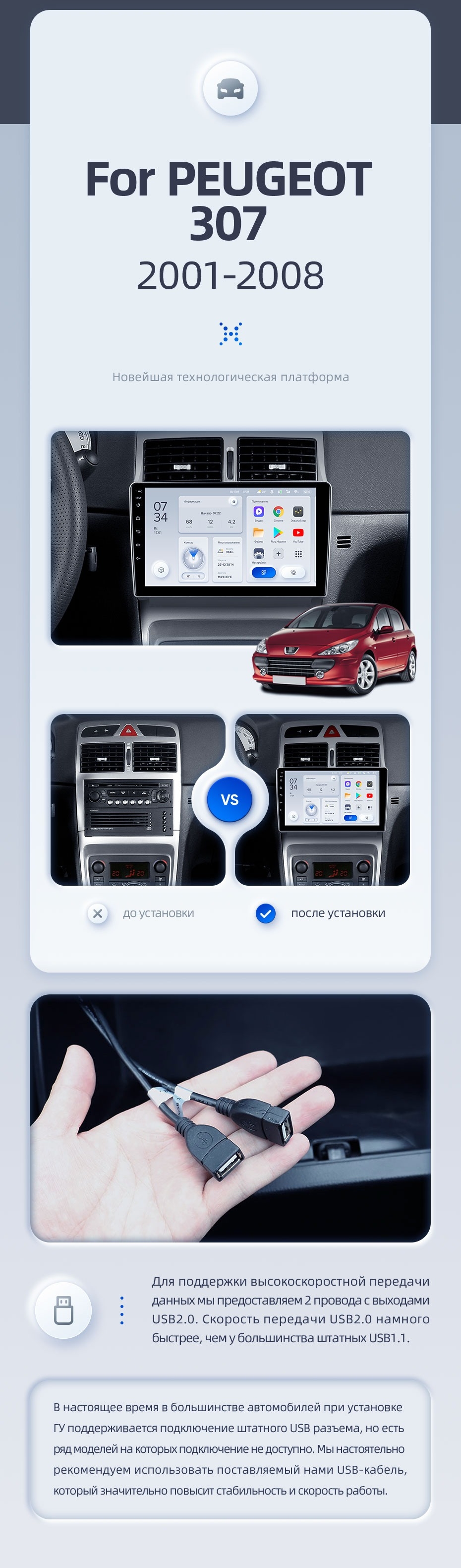 | USB | 3×USB 2.0 + USB 3.0 | Доп. аксессуары | Передняя/задняя AHD-камера, DVR-регистратор, TPMS, парковочный OBD, Type-C → HDMI |