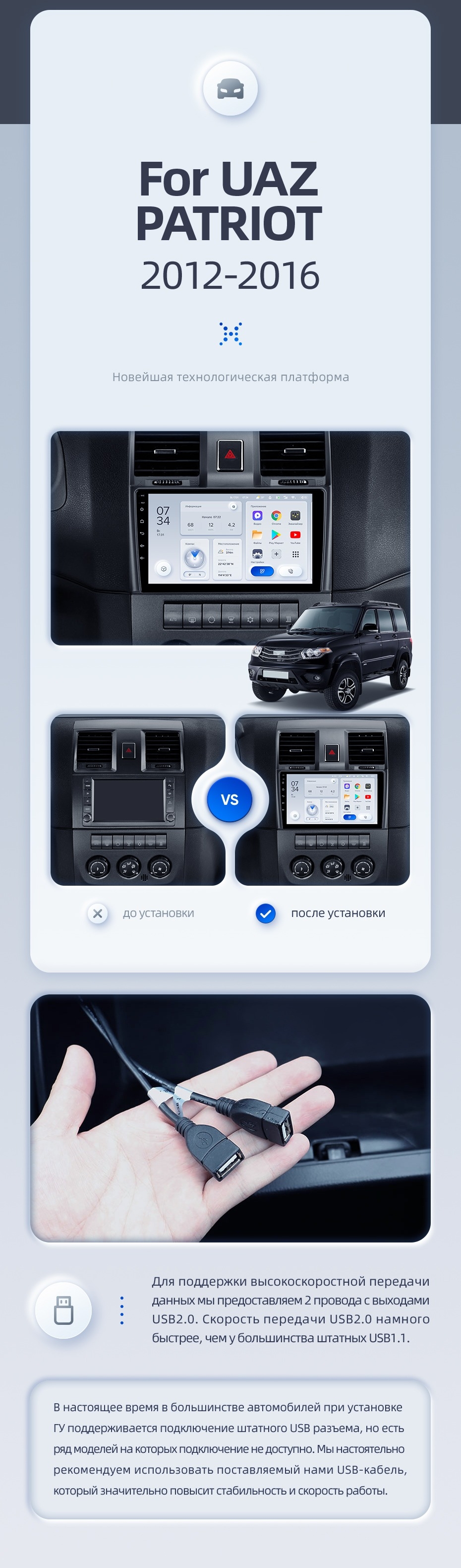 | USB | 3×USB 2.0 + USB 3.0 | Доп. аксессуары | Передняя/задняя AHD-камера, DVR-регистратор, TPMS, парковочный OBD, Type-C → HDMI |