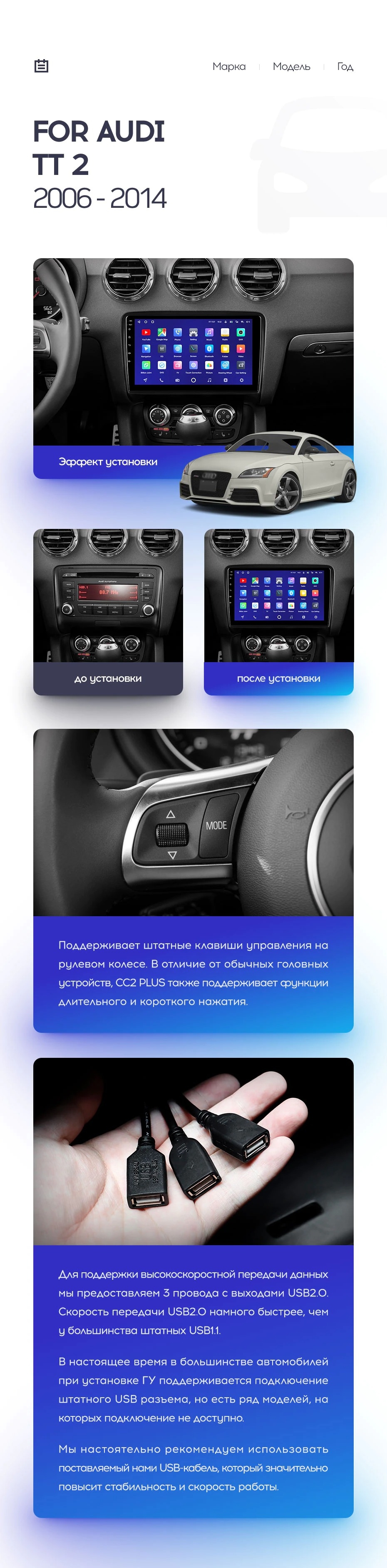 Полный комплект установки магнитолы Teyes с рамкой и проводкой можно выбрать в каталоге штатных магнитол Audi TT 2 (2006-2014).