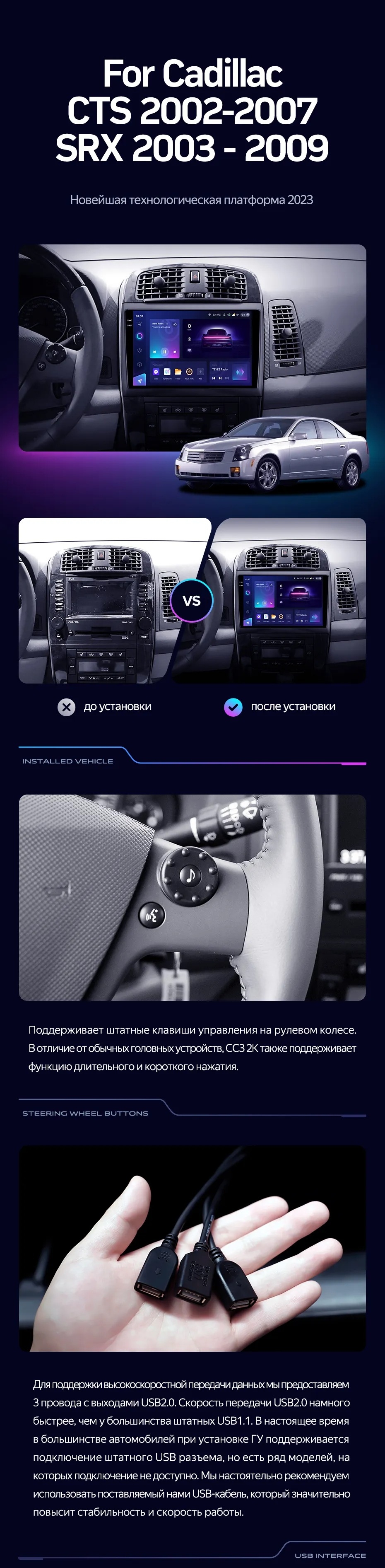 Полный комплект установки магнитолы Teyes с рамкой и проводкой можно выбрать в каталоге штатных магнитол Cadillac CTS (2002-2007).