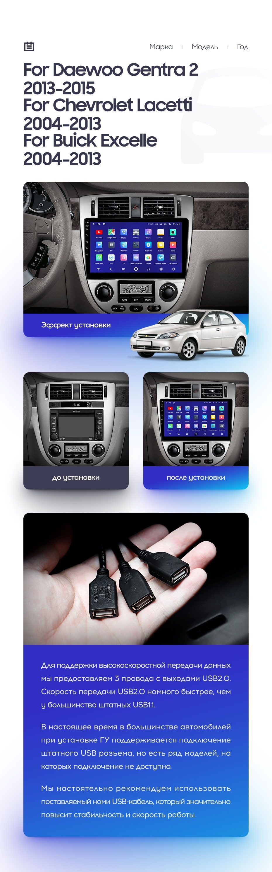 Полный комплект установки магнитолы Teyes с рамкой и проводкой можно выбрать в каталоге штатных магнитол Chevrolet Lacetti J200 (2004-2013).