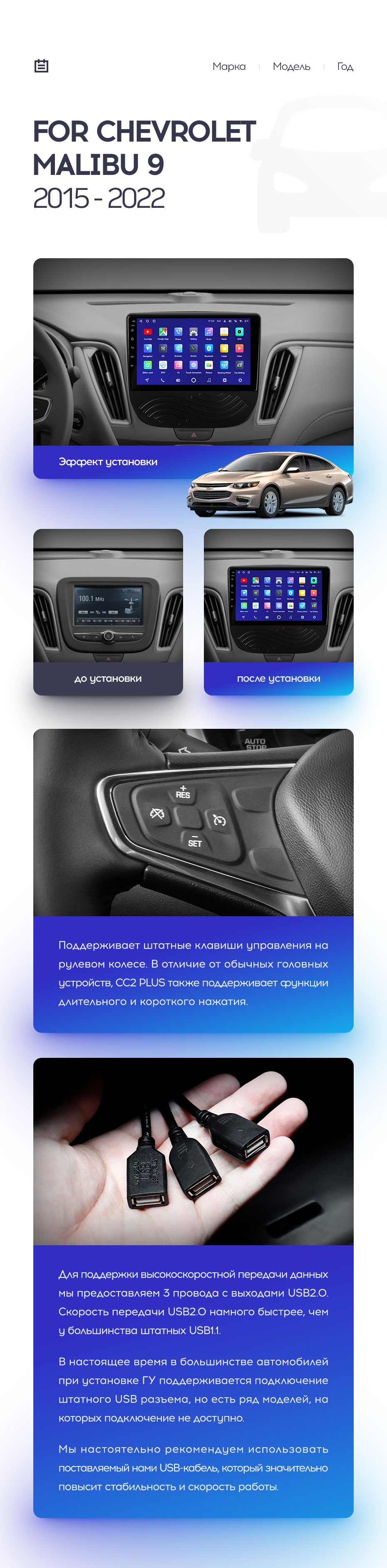 Полный комплект установки магнитолы Teyes с рамкой и проводкой можно выбрать в каталоге штатных магнитол Chevrolet Malibu 9 (2015-2020).