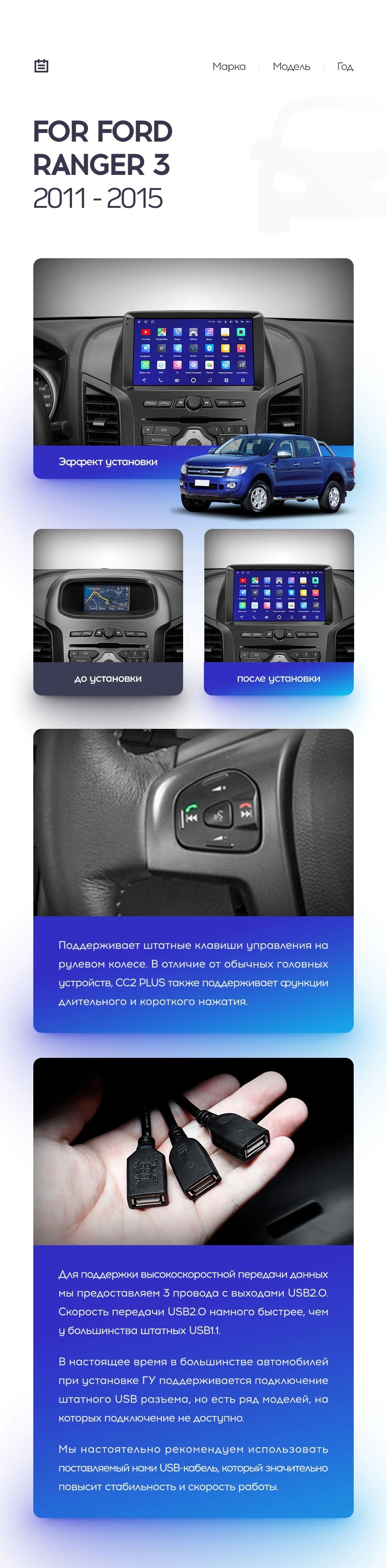 Полный комплект установки магнитолы Teyes с рамкой и проводкой можно выбрать в каталоге штатных магнитол Ford Ranger (2011-2016).