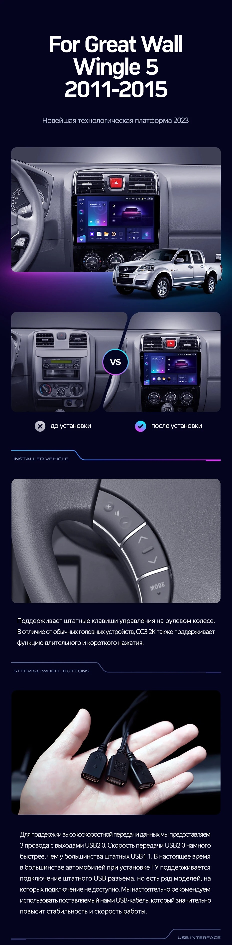 Полный комплект установки магнитолы Teyes с рамкой и проводкой можно выбрать в каталоге штатных магнитол Great Wall Wingle 5 (2011-2015).