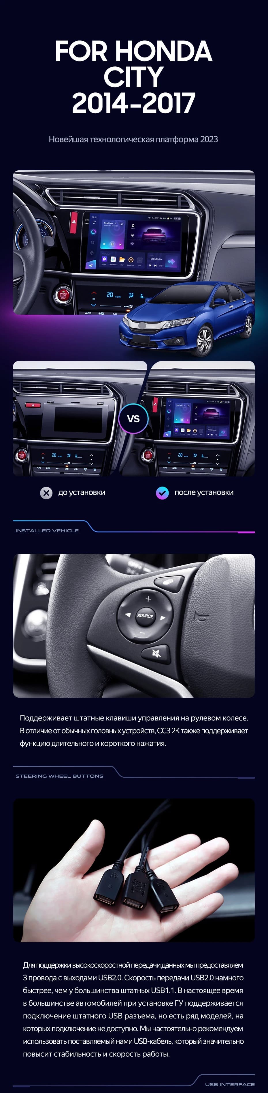 Полный комплект установки магнитолы Teyes с рамкой и проводкой можно выбрать в каталоге штатных магнитол Honda City (2014-2017).