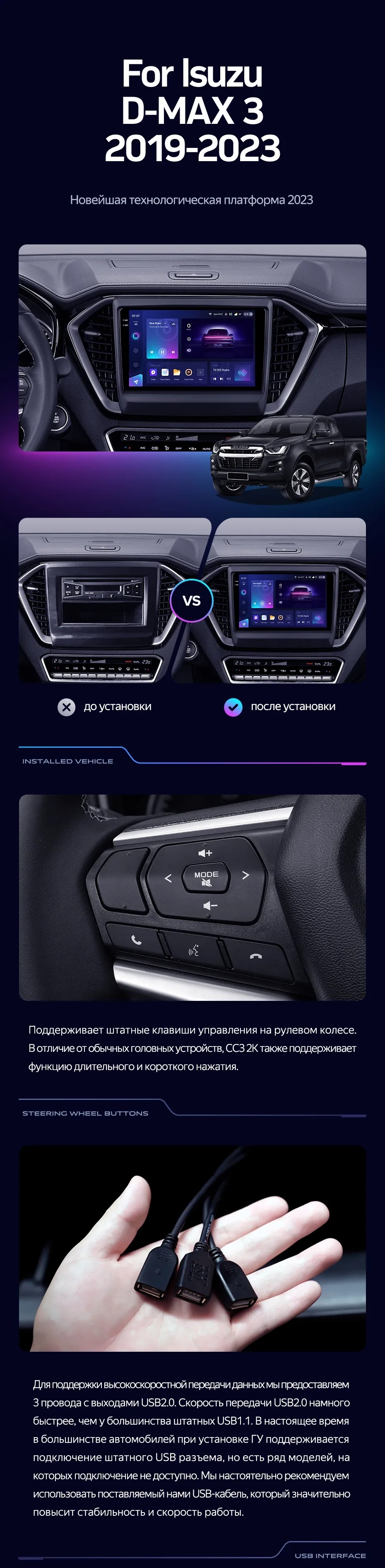 Полный комплект установки магнитолы Teyes с рамкой и проводкой можно выбрать в каталоге штатных магнитол lsuzu D-MAX 3 RG (2019-2023).