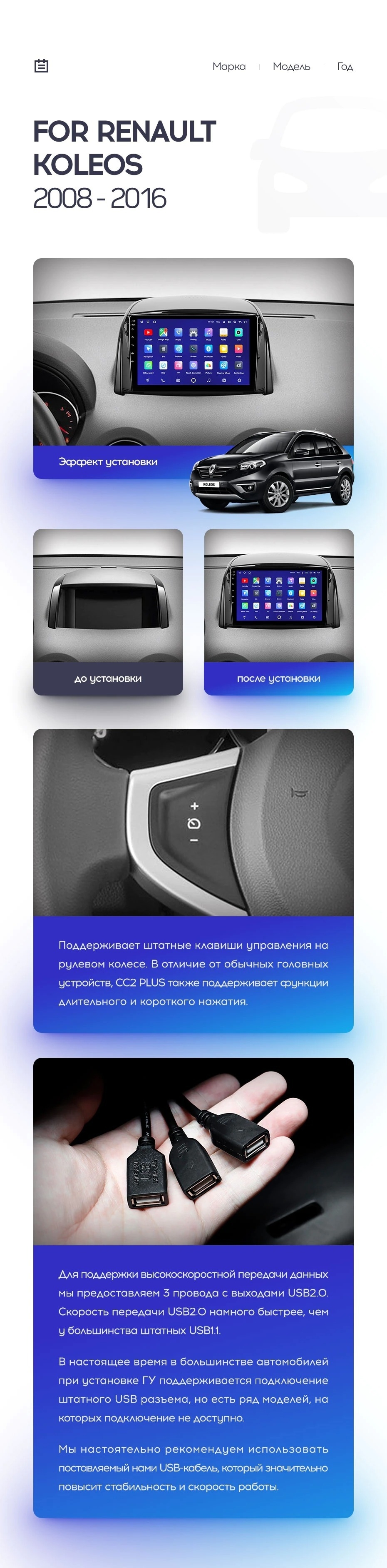 Полный комплект установки магнитолы Teyes с рамкой и проводкой можно выбрать в каталоге штатных магнитол Renault Koleos (2008-2016).