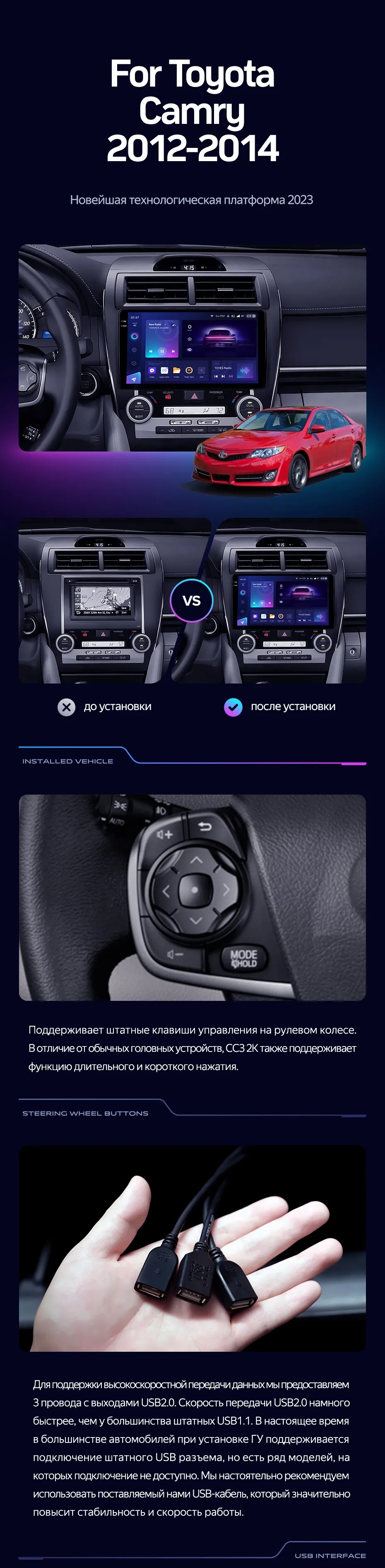 Полный комплект установки магнитолы Teyes с рамкой и проводкой можно выбрать в каталоге штатных магнитол Toyota Camry 7 XV 50 55 (2012-2014).