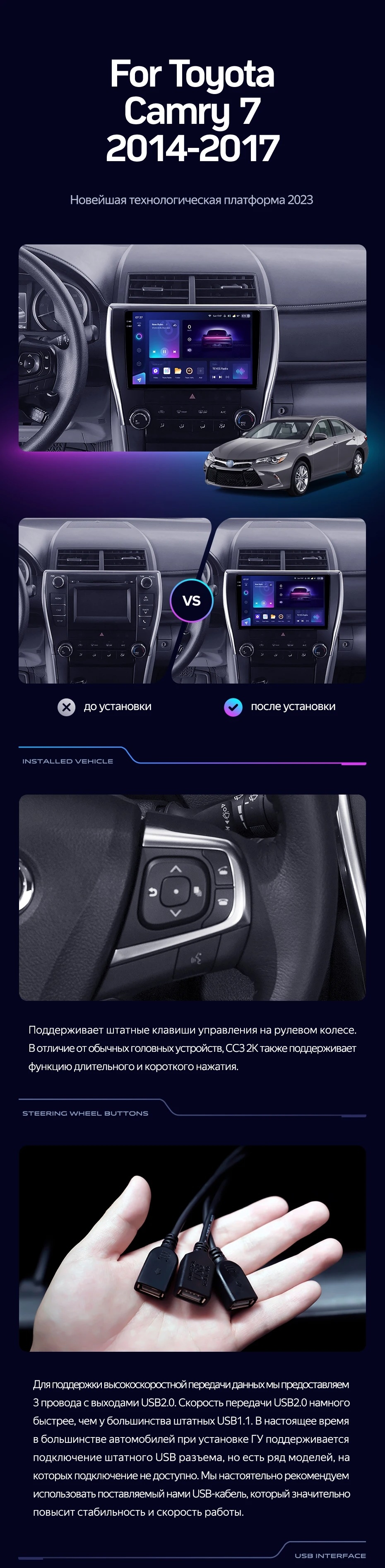 Полный комплект установки магнитолы Teyes с рамкой и проводкой можно выбрать в каталоге штатных магнитол Toyota Camry 7 XV 50 55 (2014-2017).