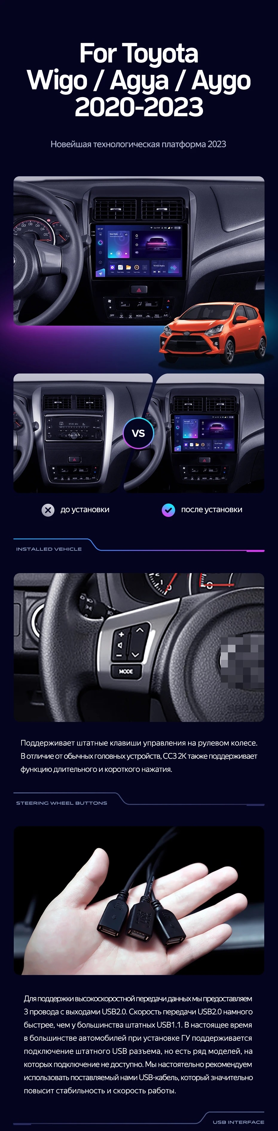 Полный комплект установки магнитолы Teyes с рамкой и проводкой можно выбрать в каталоге штатных магнитол Toyota Wigo/Agya (2020-2023).