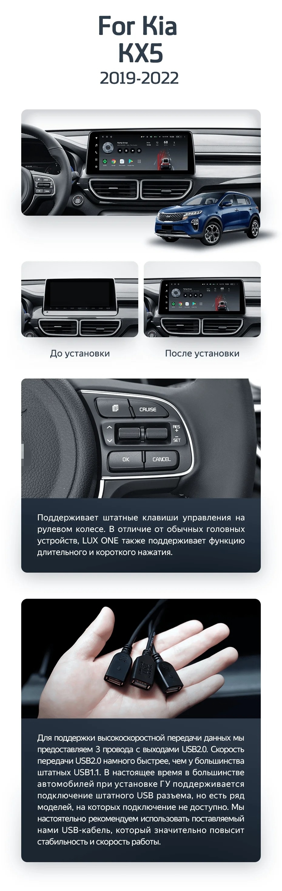 Полный комплект установки магнитолы Teyes с рамкой и проводкой можно выбрать в каталоге штатных магнитол Kia KX5 (2019-2022).